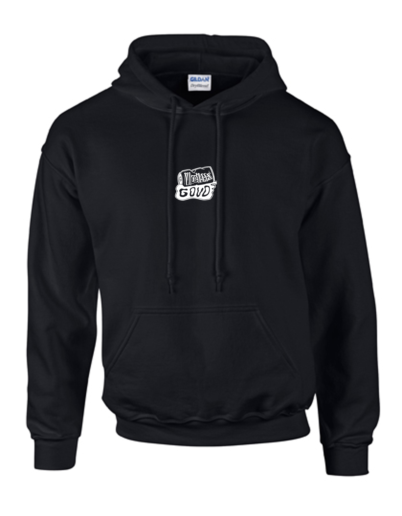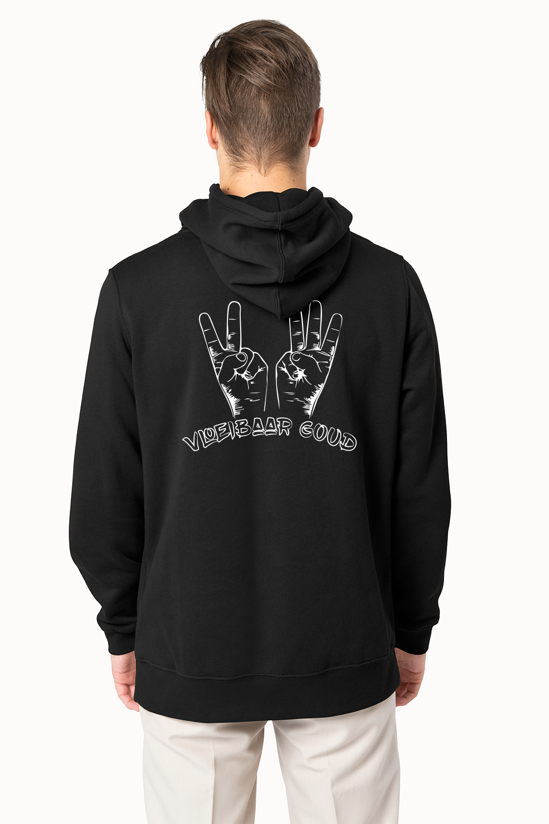 Zwarte trui met witte bedrukking van het Vloeibaar Goud logo op de borstkas.